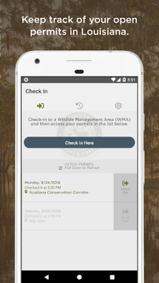 The Louisiana Department of Wildlife and Fisheries makes public lands available for recreation across the state. The LDWF Self-Clearing Permit App is a powerful tool for users of LDWF-administered lands (Wildlife Management Areas (WMAs), Refuges, and Wildlife Conservation Areas (WCAs)) to complete the required self-clearing permit process from their mobile device. While physical self-clearing permit stations are available on WMAs, refuges, and WCAs, LDWF offers this convenient mobile option to provide easy compliance with the self-clearing permit process. This application features a convenient, organized drop-down interface from which users may check in and out when they visit an LDWF-administered land.