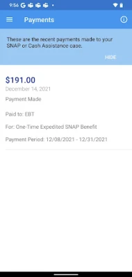 The Payments section of the app lets you view upcoming and past payments for your case, such as payments made to your landlord, utility company, or to your EBT card.
