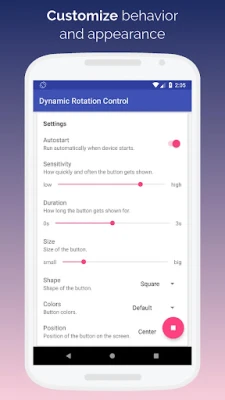 Positions can be chosen for landscape and portrait separately, so the button is always easy to reach, no matter how you're holding your phone. The color chooser includes a transparency setting which allows to make the button super unobtrusive. The sensitivity setting controls how far you need to turn the phone before the button is shown. And autostart means that you never have to open the app settings again after the initial configuration.