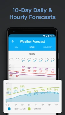 - Hyperlocal weather conditions: track current conditions from your local weather station, as well as hourly/daily forecasts up to 10 days in the future, which include chance of rain and precise weather news.